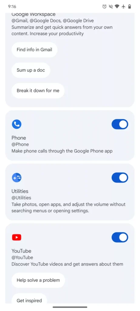 سومین افزونه Utilities نام دارد. ظاهراً این افزونه، به جمینای این امکان را می‌دهد مستقیماً با تنظیمات و برنامه‌های دستگاه شما تعامل کند. بازکردن برنامه‌ها، عکاسی و تنظیم صدا ازجمله مثال‌هایی است که در تصویر بالا به آن‌ها اشاره شده است؛ به‌علاوه دستوراتی مانند فعال‌سازی دارک‌مود، بازکردن قفل گوشی و ری‌استارت‌کردن آن نیز احتمالاً به‌همین روش انجام خواهد شد.